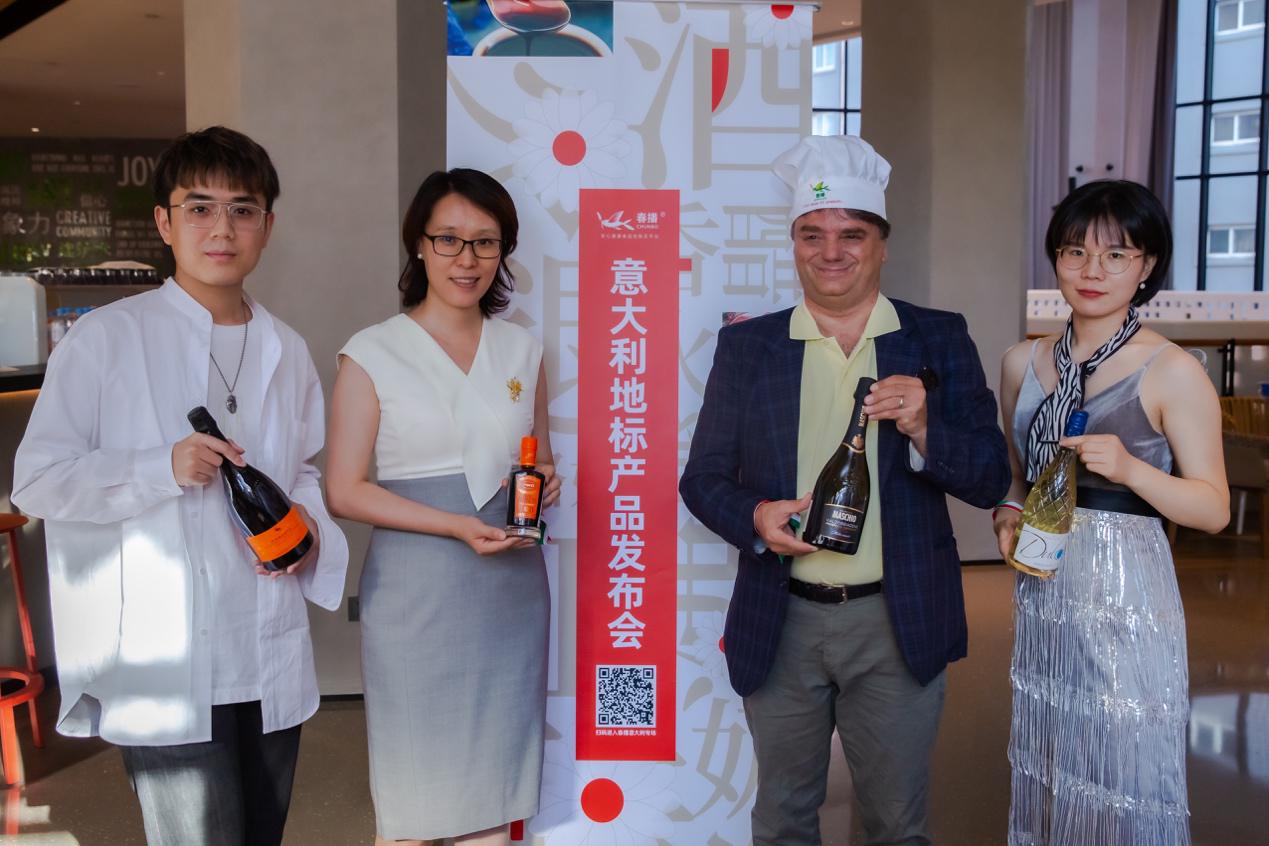 图:意大利对外贸易委员北京办事处首席代表、中国区总协调官GianpaoloBruno先生(右二)及春播工作人员为现场嘉宾展示本次联合推广的意大利地标产品
